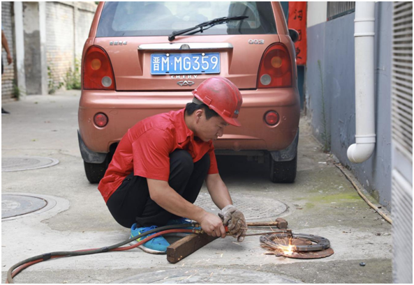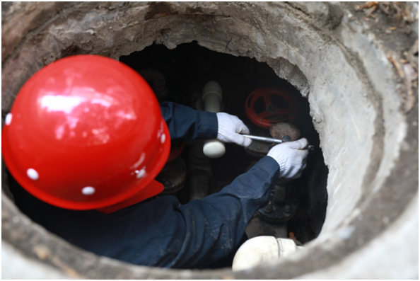 大暑節(jié)氣,天氣有些悶熱,最高氣溫超過36度。位于薈萃北區(qū)的一棟樓前,運(yùn)行經(jīng)營一分公司兩名穿著工作服的檢修人員揭開檢查井蓋進(jìn)行通風(fēng)換氣,系緊褲腳、戴好安全帽……做好下井準(zhǔn)備工作后,一點(diǎn)一點(diǎn)把身子探進(jìn)檢查井,工作人員在狹窄的檢查井中對到樓鎖閉閥門進(jìn)行維護(hù)保養(yǎng)。“機(jī)油槍遞給我”,狹窄的井口內(nèi),李鵬蜷縮其中,抬起掛滿汗水的臉喊道。檢查井深約3米,內(nèi)部空間狹小,最多能容納2人,在井里作業(yè),隨時會發(fā)生磕碰。在有限的作業(yè)空間內(nèi),檢修員無法伸直手臂,只能依靠腕力打開鎖頭,查看閥門狀態(tài),閥門開關(guān)是否老化損壞,管道盤根是否泄漏,接著用機(jī)油槍注入機(jī)油潤滑并抹油,扭動活動閥門,進(jìn)行回絲、鎖頭,一步一步對鎖閉閥管道進(jìn)行保養(yǎng)并清理井室內(nèi)雜物……