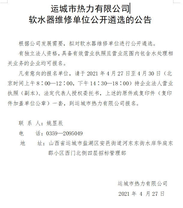 運(yùn)城市熱力有限公司 軟水器維修單位公開遴選的公告