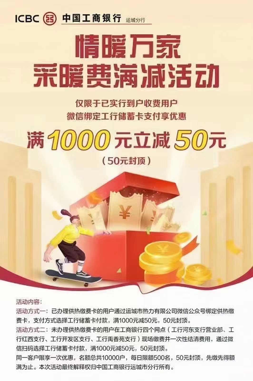 為回饋廣大市民,運(yùn)城熱力攜手工商銀行特推出“我為群眾辦實(shí)事,供熱繳費(fèi)滿減活動(dòng)“。