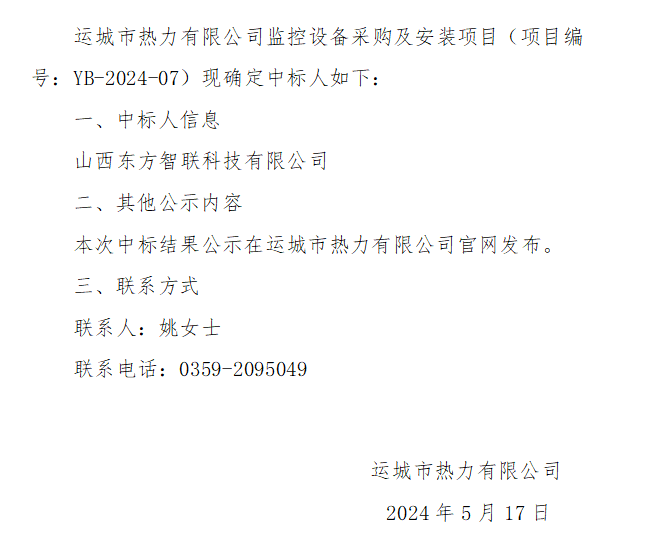 運(yùn)城市熱力有限公司監(jiān)控設(shè)備采購及安裝項(xiàng)目中標(biāo)結(jié)果公示