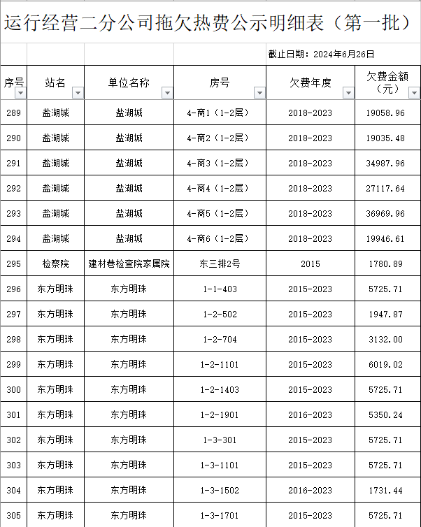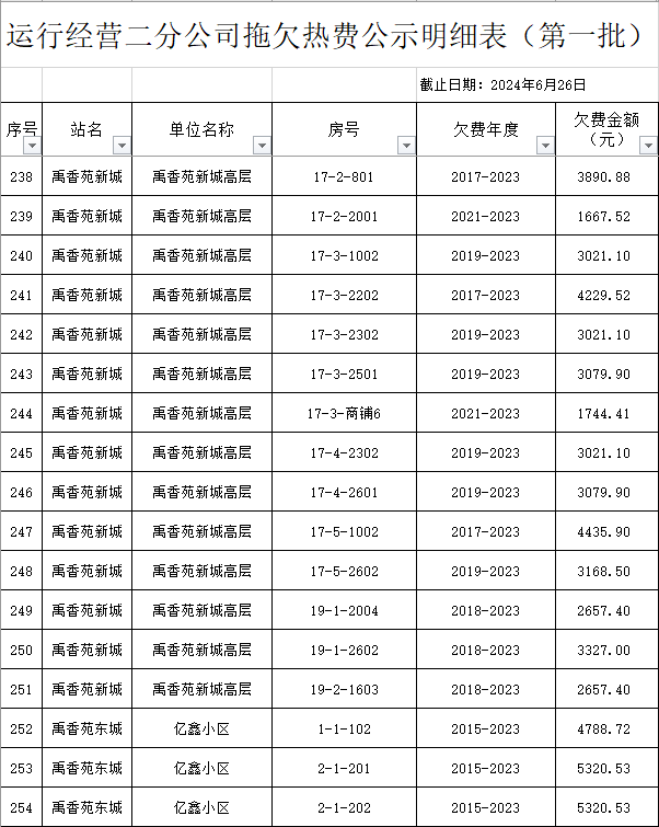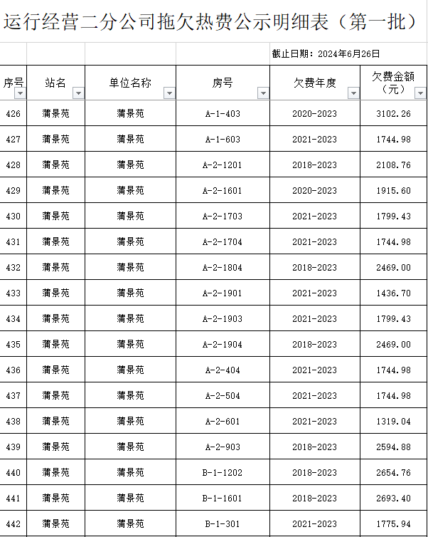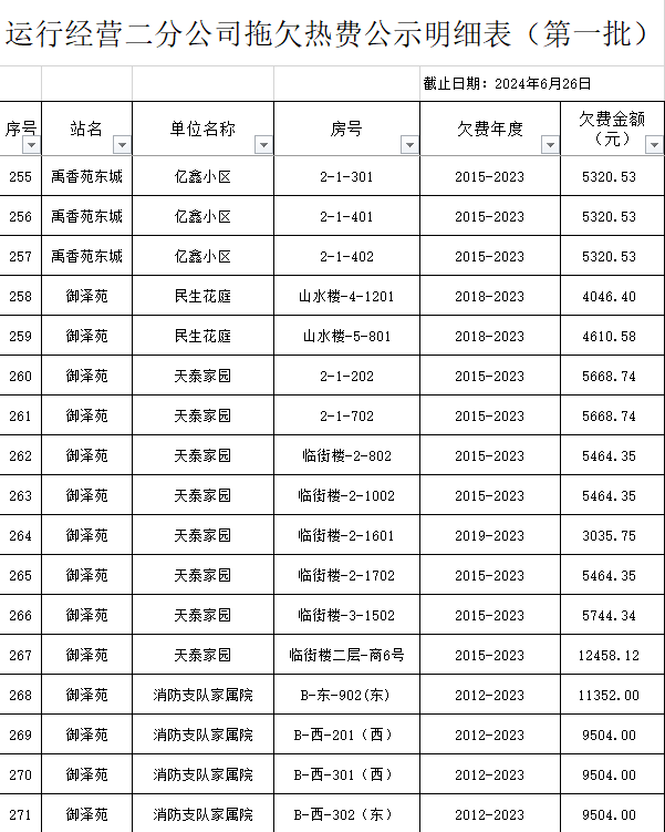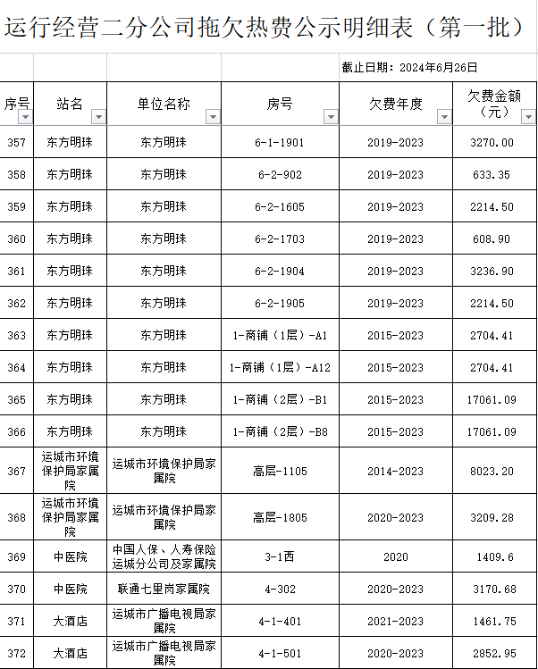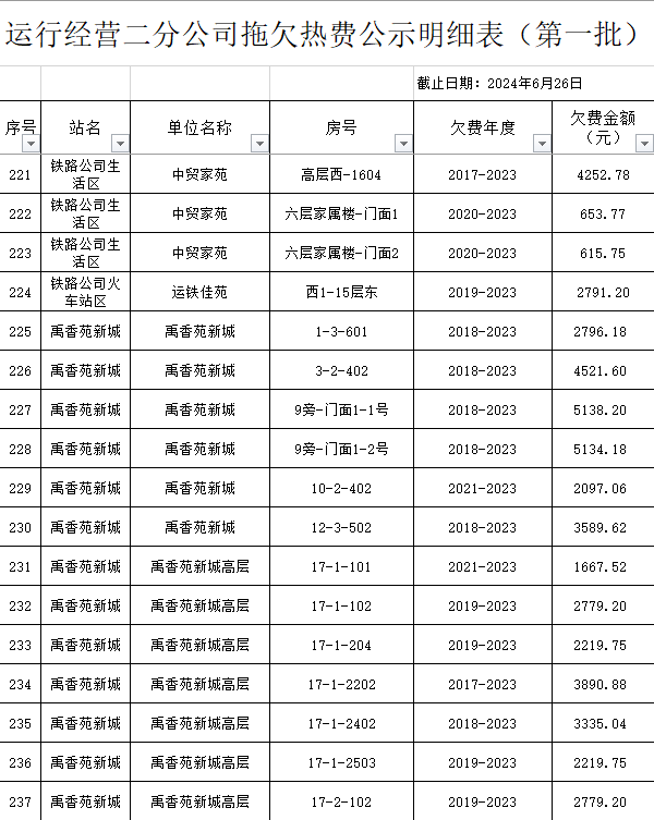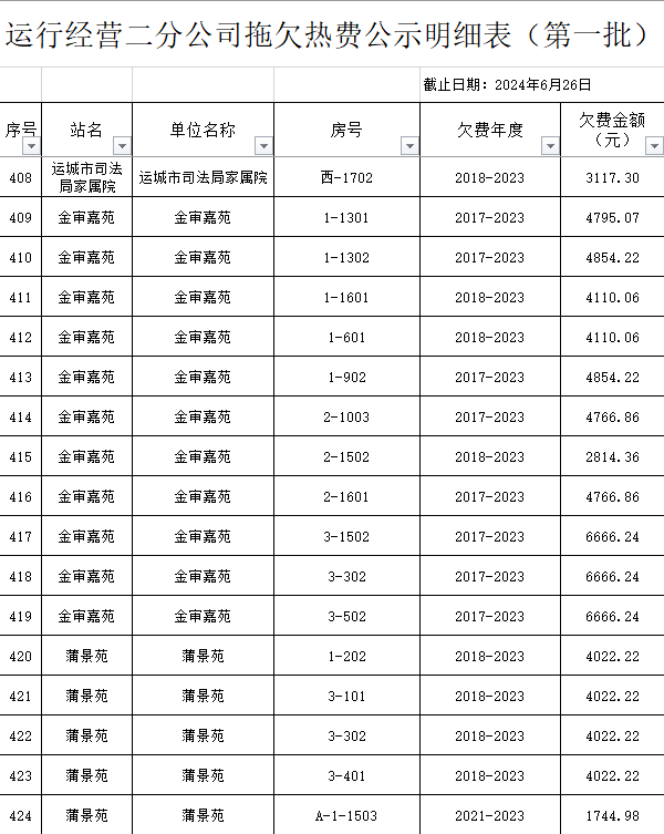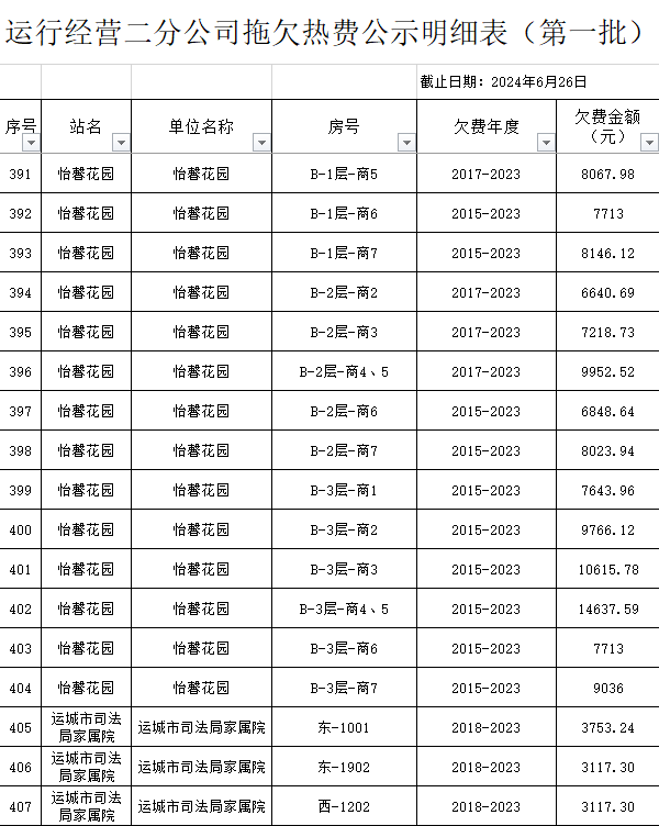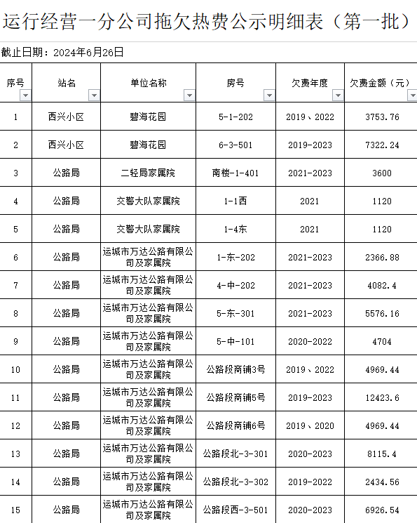 根據(jù)《運(yùn)城市中心城區(qū)集中供熱管理暫行辦法》第二十五條及運(yùn)價(jià)管字【2009】199號《關(guān)于明確集中供熱收費(fèi)有關(guān)問題的通知》第一項(xiàng)“城市供熱實(shí)行繳費(fèi)用熱的原則”,截至目前,仍有部分用戶未繳納2023年度及以前年度熱費(fèi),直接影響了供熱企業(yè)正常生產(chǎn)運(yùn)行。為了加快欠費(fèi)回籠,確保供熱企業(yè)生產(chǎn)運(yùn)行,請下列欠費(fèi)的用戶,在2024年10月30日之前交清拖欠熱費(fèi)。否則,供熱企業(yè)有權(quán)依法維護(hù)自身權(quán)益,拖欠用戶將承擔(dān)相應(yīng)的責(zé)任和由此造成的一切后果。也通過媒體公示,讓社會監(jiān)督,讓我們共同行動,共同營造良好供熱運(yùn)營環(huán)境和氛圍,為廣大居民溫暖過冬發(fā)揮各自應(yīng)有的作用。