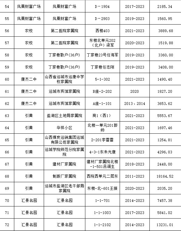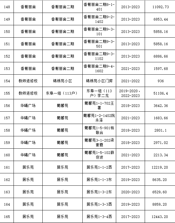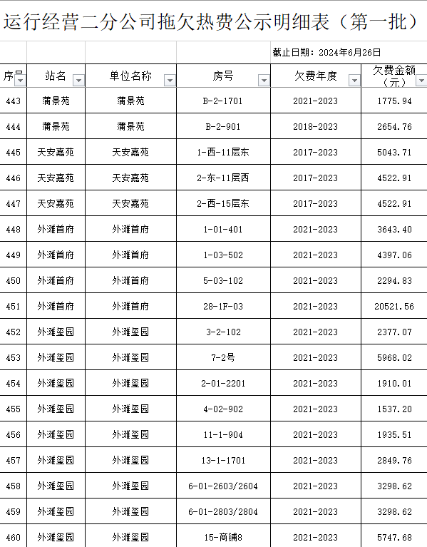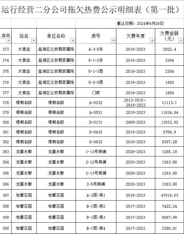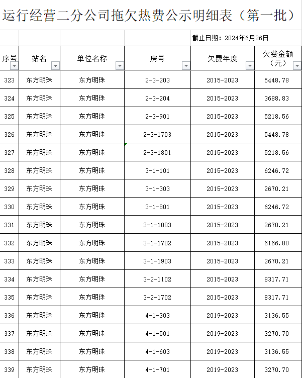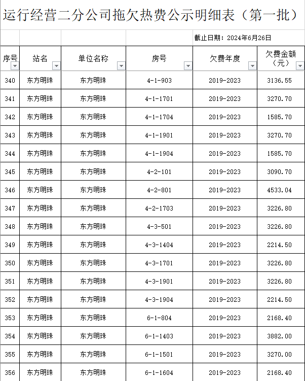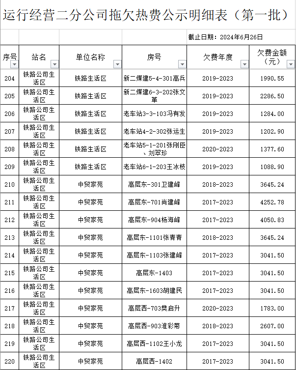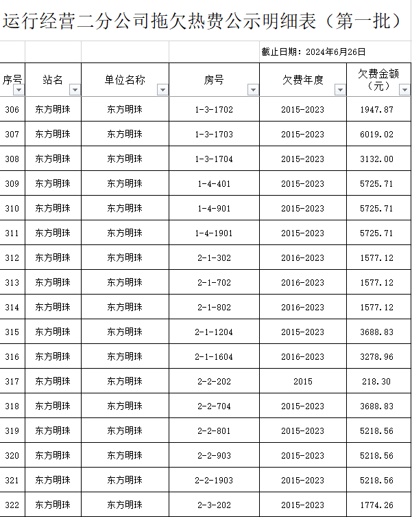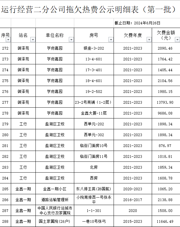 根據(jù)《運(yùn)城市中心城區(qū)集中供熱管理暫行辦法》第二十五條及運(yùn)價(jià)管字【2009】199號《關(guān)于明確集中供熱收費(fèi)有關(guān)問題的通知》第一項(xiàng)“城市供熱實(shí)行繳費(fèi)用熱的原則”,截至目前,仍有部分用戶未繳納2023年度及以前年度熱費(fèi),直接影響了供熱企業(yè)正常生產(chǎn)運(yùn)行。為了加快欠費(fèi)回籠,確保供熱企業(yè)生產(chǎn)運(yùn)行,請下列欠費(fèi)的用戶,在2024年10月30日之前交清拖欠熱費(fèi)。否則,供熱企業(yè)有權(quán)依法維護(hù)自身權(quán)益,拖欠用戶將承擔(dān)相應(yīng)的責(zé)任和由此造成的一切后果。也通過媒體公示,讓社會監(jiān)督,讓我們共同行動,共同營造良好供熱運(yùn)營環(huán)境和氛圍,為廣大居民溫暖過冬發(fā)揮各自應(yīng)有的作用。
