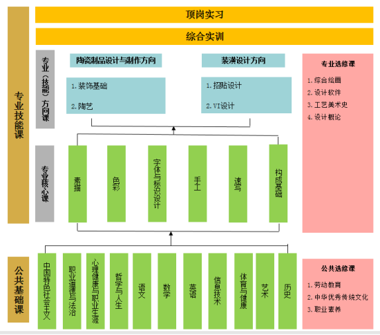 為了貫徹落實《教育部關(guān)于職業(yè)院校專業(yè)人才培養(yǎng)方案制定與實施工作的指導(dǎo)意見》(教職稱〔2019〕13號)文件要求,適應(yīng)社會經(jīng)濟發(fā)展和產(chǎn)業(yè)結(jié)構(gòu)調(diào)整對工藝美術(shù)專業(yè)技術(shù)技能人才的需求,本專業(yè)科學(xué)構(gòu)建專業(yè)課程體系,課程結(jié)構(gòu)設(shè)置如圖1所示。